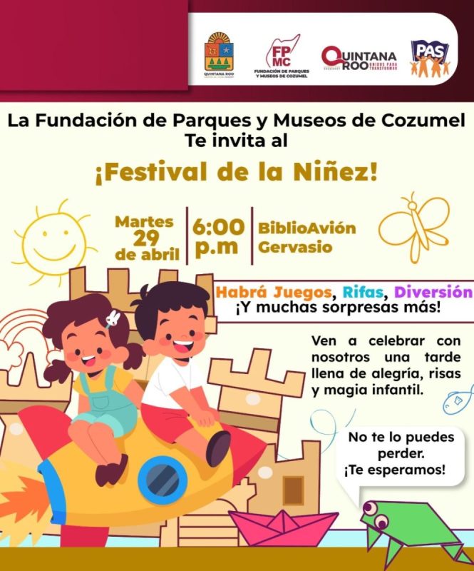 Cozumel.- La Fundación de Parques y Museos de Cozumel (FPMC) invita a todas las niñas y niños al “Festival de la Niñez”, que se llevará a cabo el próximo martes 29 de abril, a las 18:00 horas, en el BiblioAvión Gervasio, donde se realizará este evento familiar que será una tarde llena de alegría, juegos, risas y sorpresas para celebrar a lo grande a las infancias.
