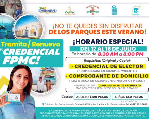MásCozumel.- Del lunes 12 al viernes 16 de julio, la Fundación de Parques y Museos de Cozumel (FPMC) ampliará el horario de